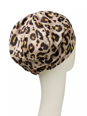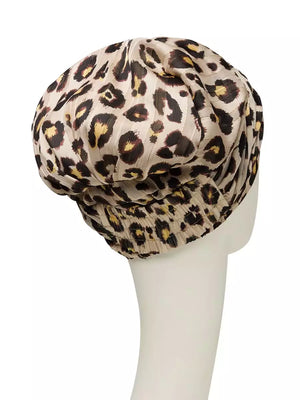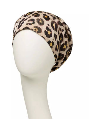 Fallegt og vandað höfuðfat frá Christine Headwear með hlébarðamunstri og gullþráðum. Húfan býður upp á ýmsa möguleika þar sem hægt er að taka höfuðband af og nota sér, eða með öðrum höfuðfötum.