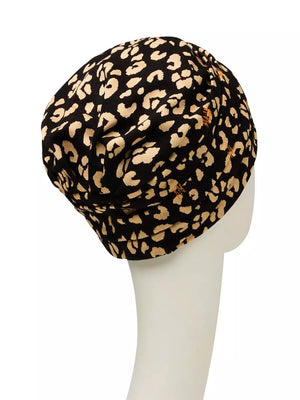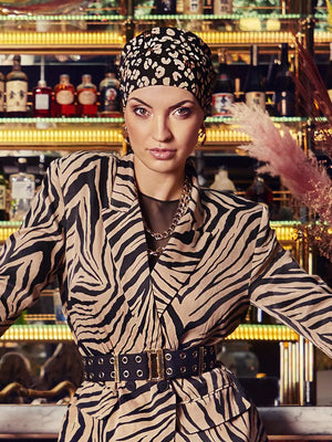 Ruby Skye is made of soft, black viscose fabric and decorated with camel-coloured leopard spots. As a contrast to the black colour, we have added small orange zigzag stitches that shape and hold the small layers around the turban together.