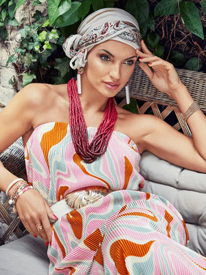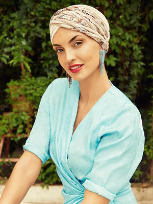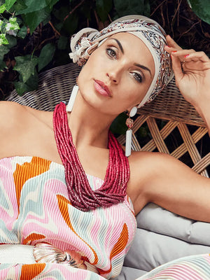 The Scarlett model is a popular, stylish, and versatile turban. The base model is made with extra fabric at the back so the turban can be styled with a baggy effect or a tight fit if you tuck the fabric under the headband at the back. The headband is attached to the back of the turban with a click system and consist of several bands in different materials and colour combinations. The headband has a elastic piece at the back, so it is easy to apply over the turban base. The Scarlett turban is made of polyester, which is silky to the look and touch. Inside the turban is lined with a comfortable bamboo-viscose material, so it is soft and comfortable to wear against the skin. The light and lovely chalk-coloured base turban is decorated with the Oriental Rose Paisley band and shiny, chalk-coloured strings. The newly added piping, on the headband, is same fabric as on the base turban. The wonderful paisley is a mix of burgundy red, turquoise, beige, and soft rose colours, a fine and elegant mix that suits both pale and summer brown skin tones.