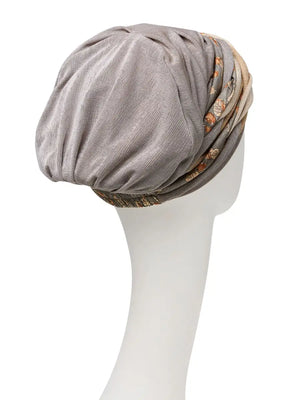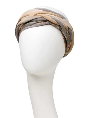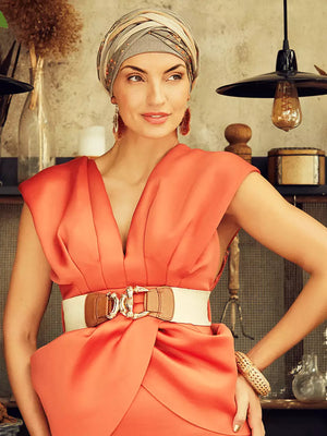The Scarlett model is a popular, stylish, and versatile turban. The base model is made with extra fabric at the back so the turban can be styled with a baggy effect or a tight fit if you tuck the fabric under the headband at the back. The headband is attached to the back of the turban with a click system and consist of several bands in different materials and colour combinations. The headband has a elastic piece at the back, so it is easy to apply over the turban base. The Scarlett turban is made of polyester, which is silky to the look and touch. Inside the turban is lined with a comfortable bamboo-viscose material, so it is soft and comfortable to wear against the skin. The turban is made in a light weight, shiny taupe coloured fabric. A beautiful dusty green sateen band forms the bigger part of the click-on headband design. This is the perfect base for the flower print with stems in brown and glittery gold foil mixed with a bright contrasted orange flower. Mix the turban with bright tops in orange, copper, white and brown or style it with a blue denim dress.